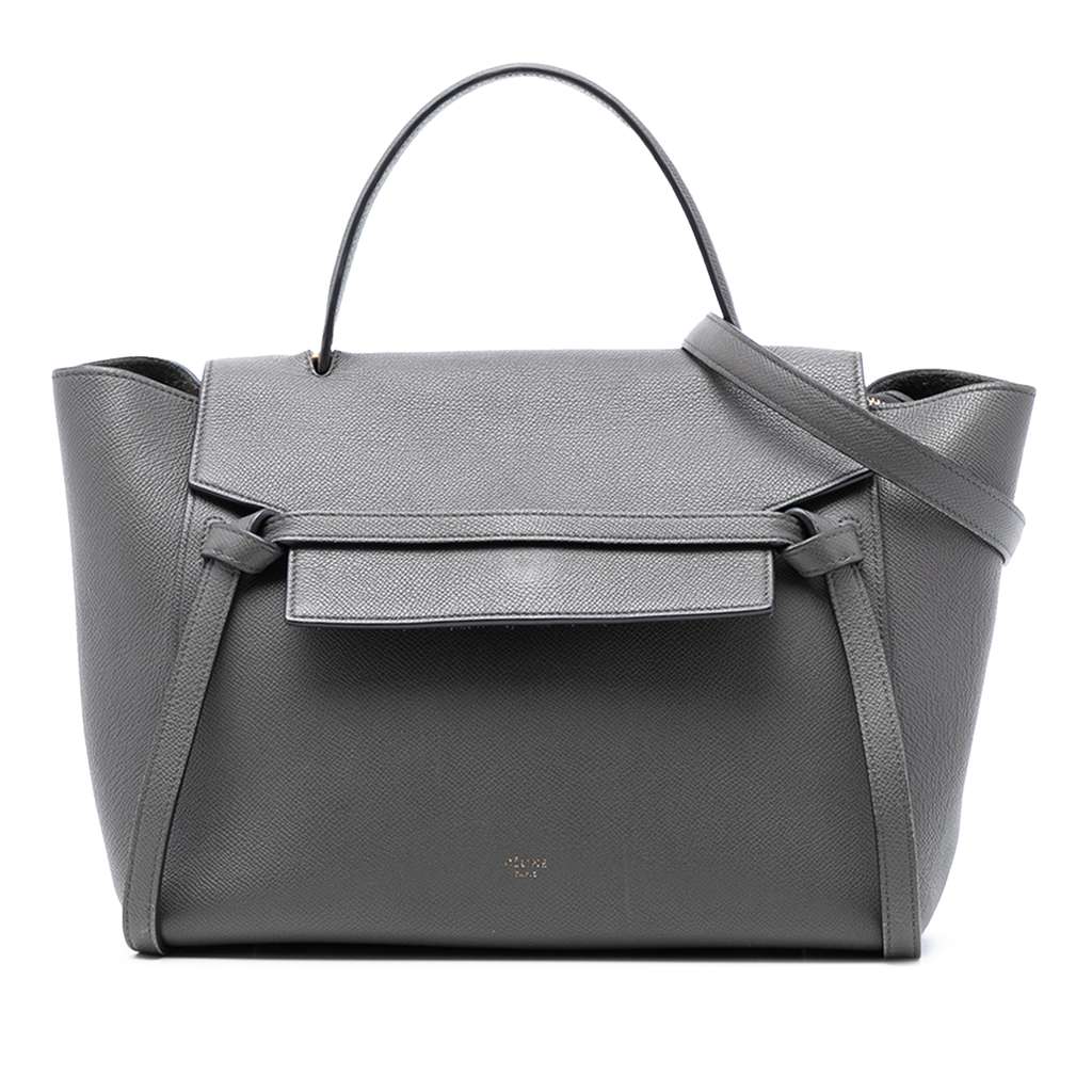 The Mini Belt Bag features a leather body, a flat leather top handle, a detachable flat leather strap, a front flap with a top zip closure, an exterior back zip pocket, and interior slip pockets. The corners were repainted.