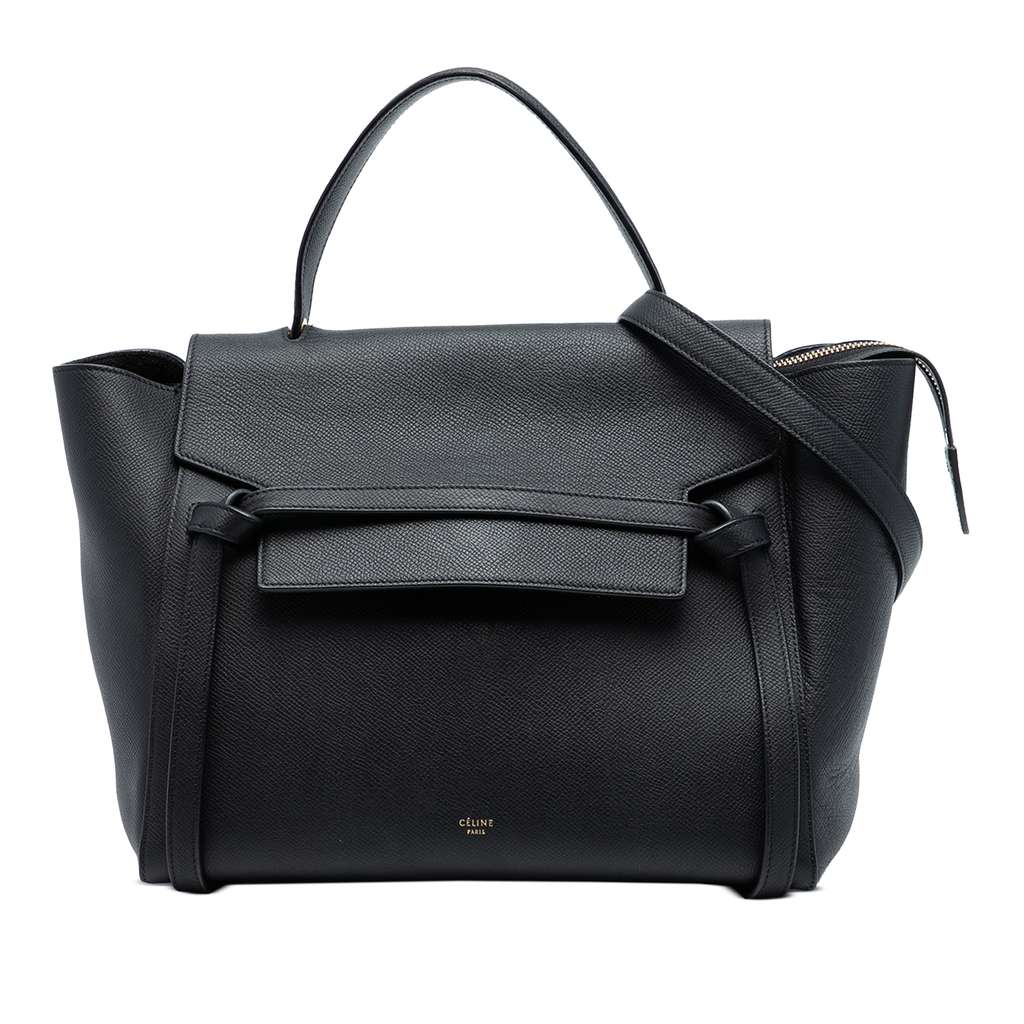 The Mini Belt Bag features a leather body, a flat leather top handle, a detachable flat leather strap, a front flap with slip-through closure, a top zip closure, an exterior back zip pocket, and interior slip pockets.