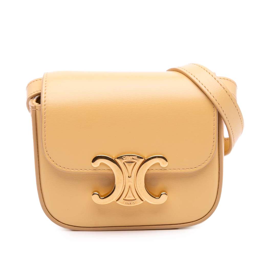 The Triomphe crossbody bag features a leather body, an adjustable flat leather strap, a front flap with magnetic snap closure, and an interior slip pocket.