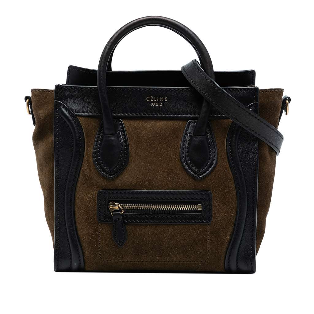 The Luggage Tote features a suede and leather body, rolled leather handles, a detachable flat shoulder strap, a top zip closure, an exterior front zip pocket, and an interior slip pocket.