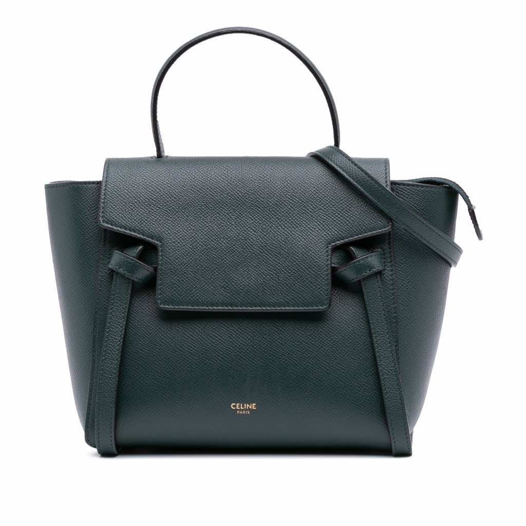 The Belt satchel features a leather body, a flat leather top handle, a detachable flat leather strap, a front flap with magnetic snap closure, and a top zip closure.