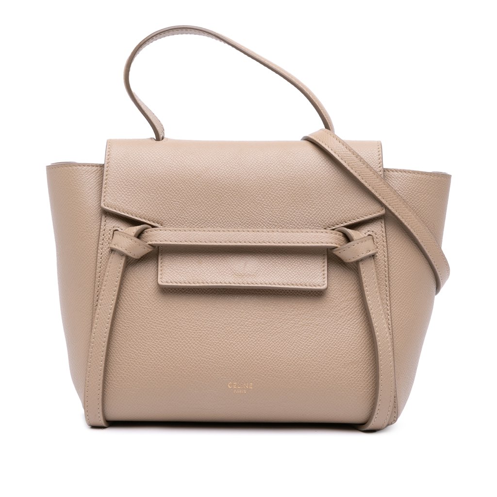 The Belt bag features a leather body, a flat leather handle, a detachable flat leather shoulder strap, a flap with slip-through closure, and a top zip closure.
