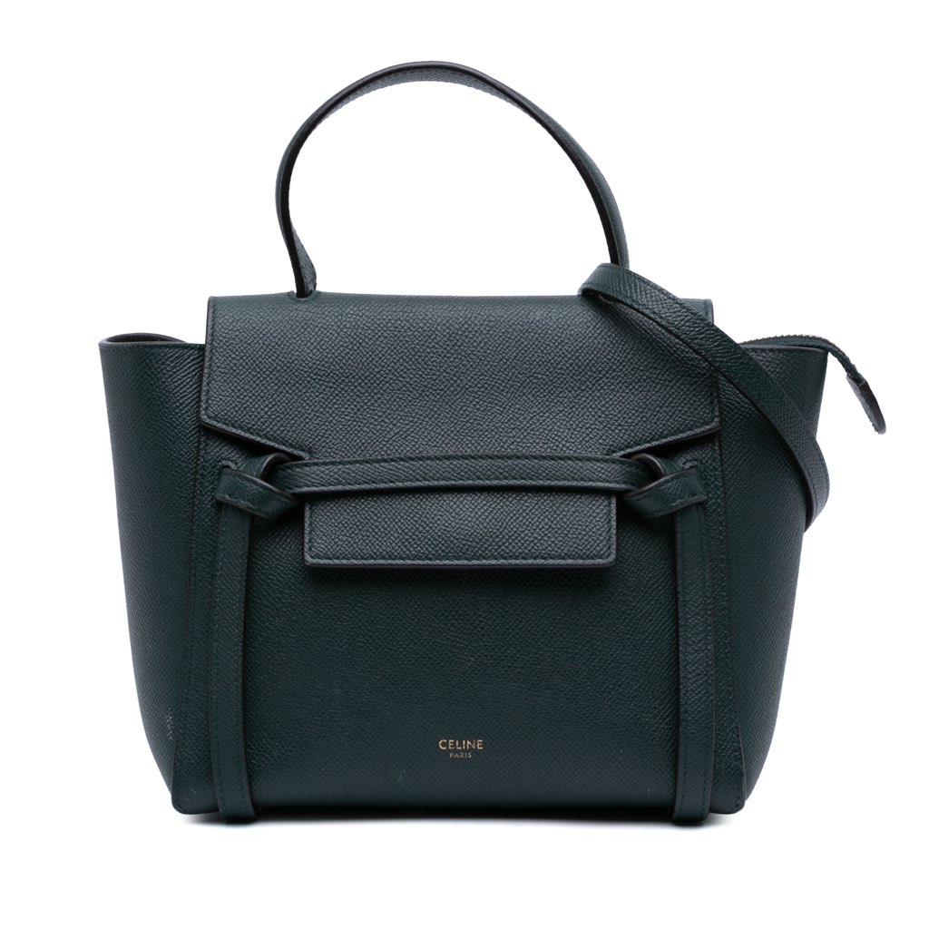 The Belt satchel features a leather body, a flat leather top handle, a detachable flat leather strap, a front flap with magnetic snap closure, and a top zip closure.