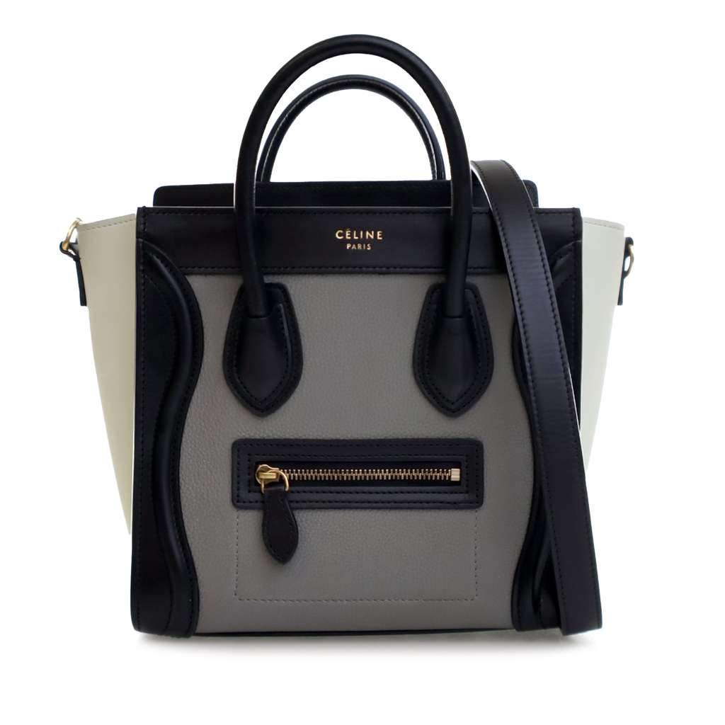 The Nano Luggage Tote features a leather body with nubuck side panels, rolled leather handles, a detachable flat leather shoulder strap, a top zip closure, an exterior front zip pocket, and interior slip pockets.