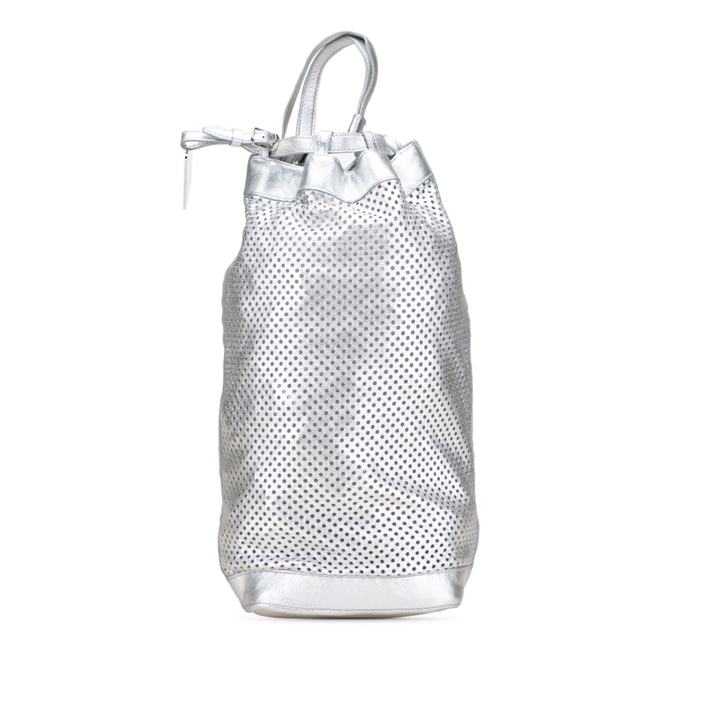 This backpack features a perforated leather body, adjustable flat leather back straps, an open top with a drawstring closure, and a zip pouch inclusion.