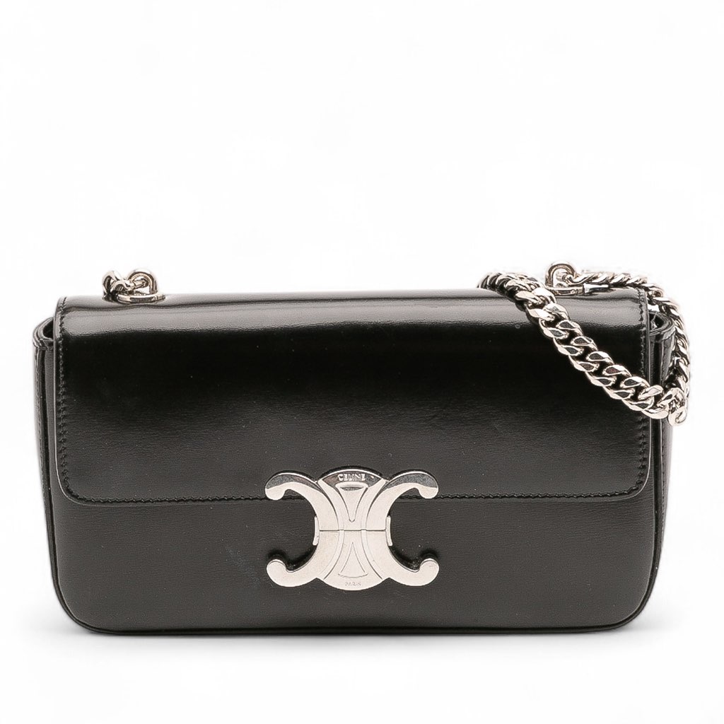This shoulder bag features a leather body, a silver-tone chain-link shoulder strap, a front flap with magnetic snap closure, and an interior slip pocket.