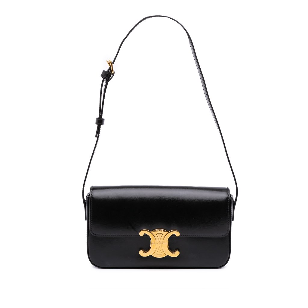 This shoulder bag features a leather body, an adjustable flat shoulder strap, a front flap with push-lock closure, and an interior slip pocket.