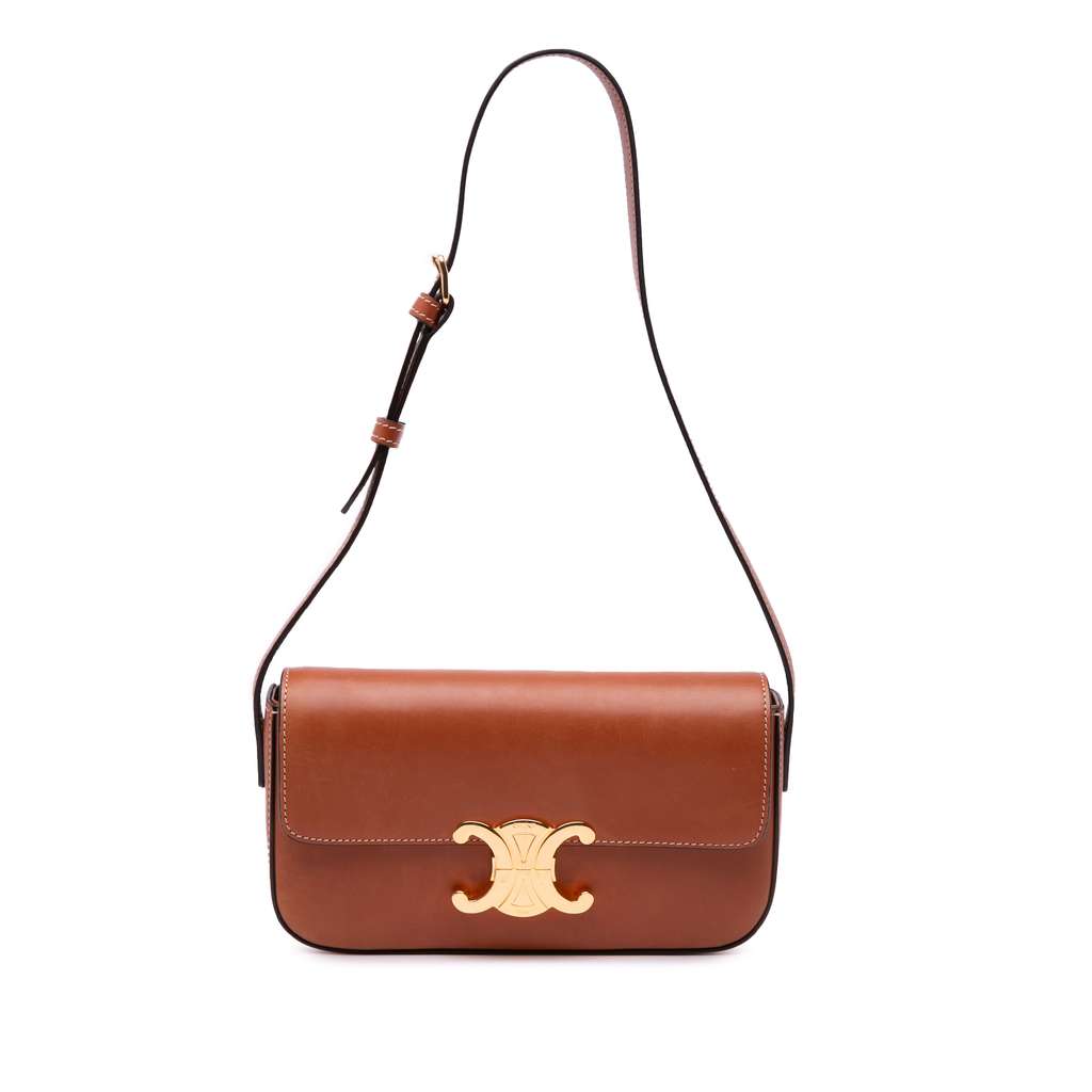This shoulder bag features a leather body, an adjustable flat leather shoulder strap, a front flap with push-lock closure, and an interior slip pocket.