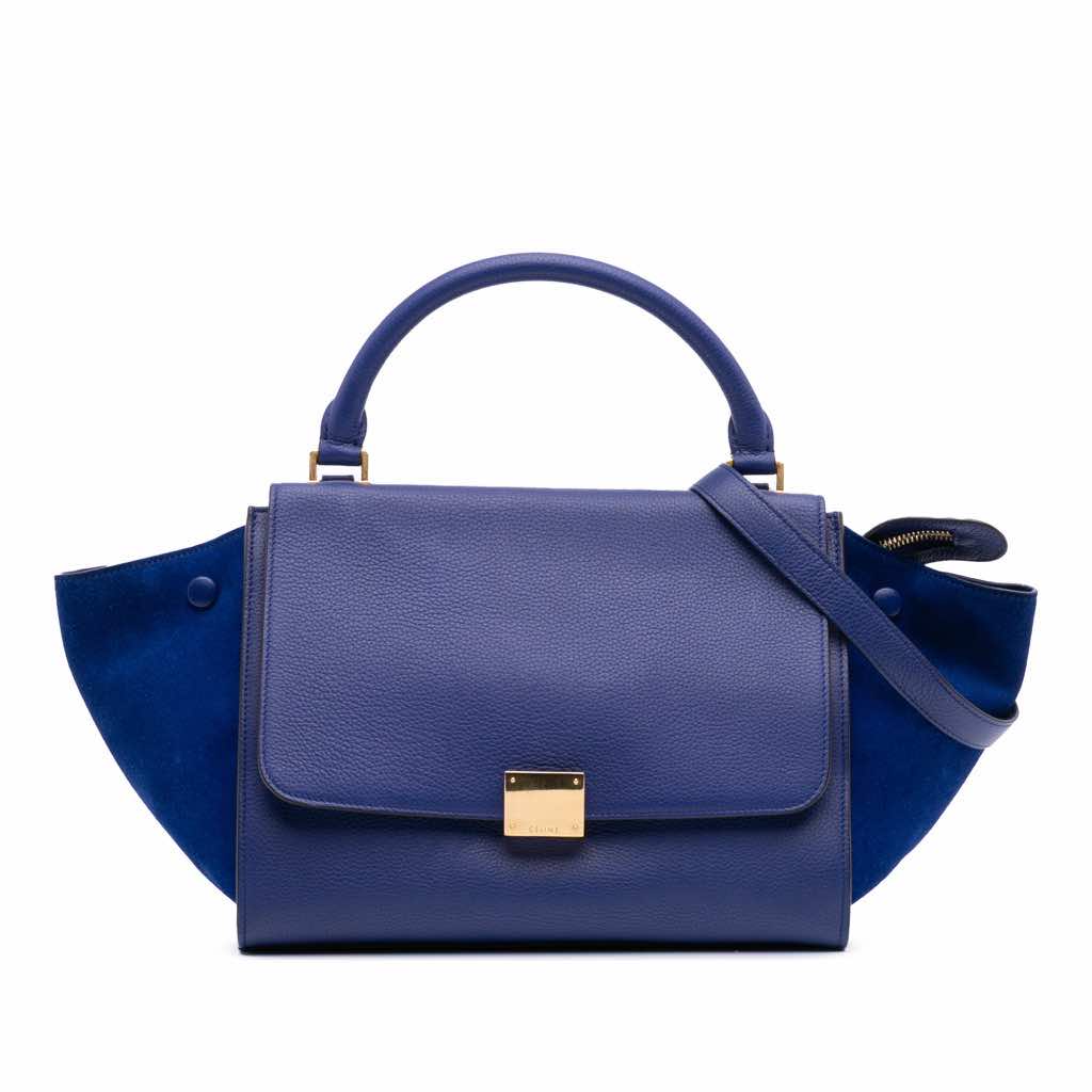 The Trapeze features a leather body with suede side panels, a rolled top handle, a detachable flat strap, a front flap with a clasp closure, a top zip closure, an exterior back zip pocket, and interior slip pockets.