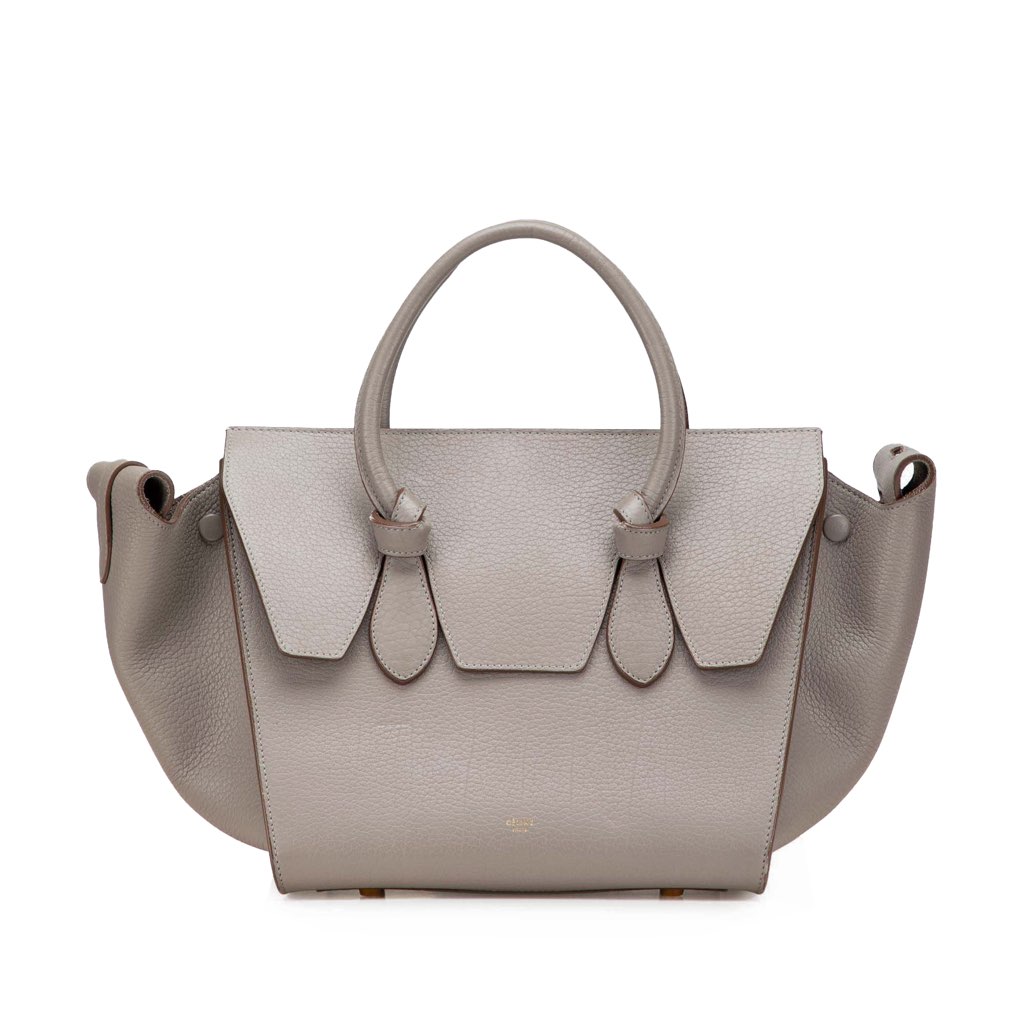 The Tie Knot handbag features a leather body, rolled leather handles, a top flap and pull-through closure, and interior zip and slip pockets.