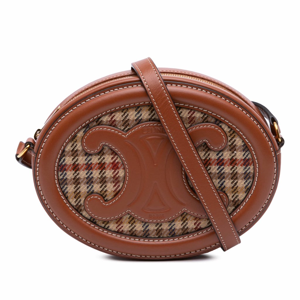The Triomphe Oval Crossbody features a leather and canvas body, a flat leather shoulder strap, and a top zip closure.