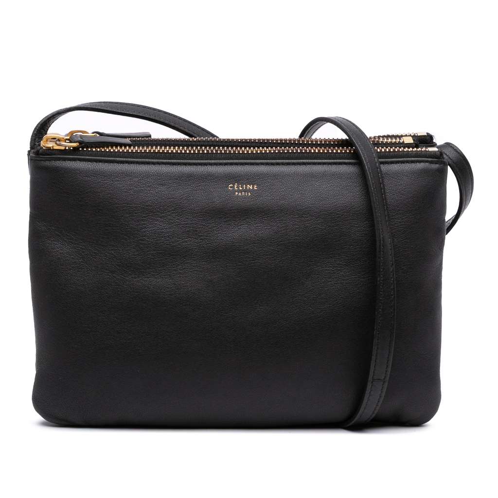 The Trio crossbody bag features a lambskin leather body, a flat leather shoulder strap, and three top zip closures.