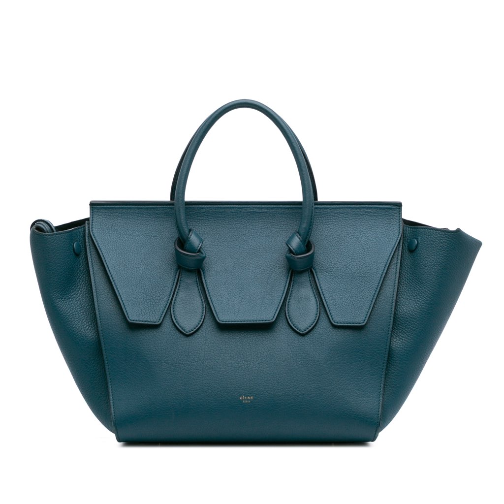 The Tie Tote bag features a leather body, rolled leather handles, an open top with a flap, and interior zip and slip pockets.