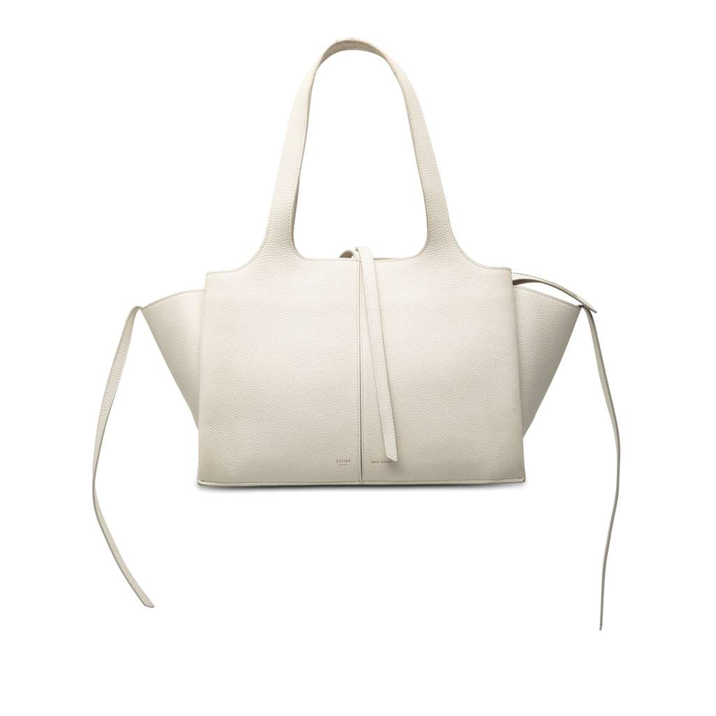 The Small Trifold tote bag features a leather body, flat leather straps, triple compartments, top zip closure, and interior slip pockets.