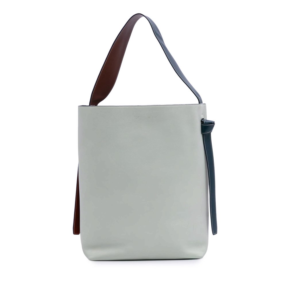 The Twisted Cabas features a leather body, a flat leather shoulder strap, an open top, and a pouch inclusion.