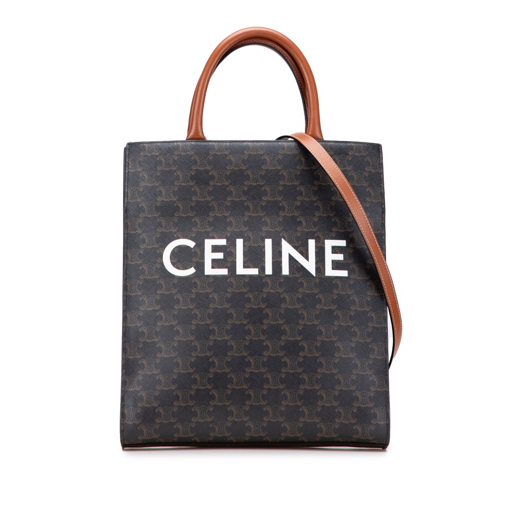The Vertical Cabas Tote features a coated canvas body, rolled leather handles, a flat leather strap, an open top, and an interior zip pocket.