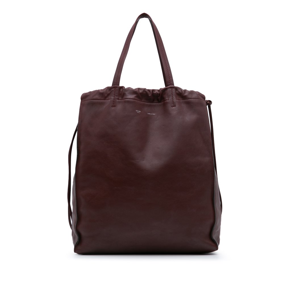 The Coulisse features a leather body, flat leather handles, an open top with drawstring closure, and an interior zip pocket.