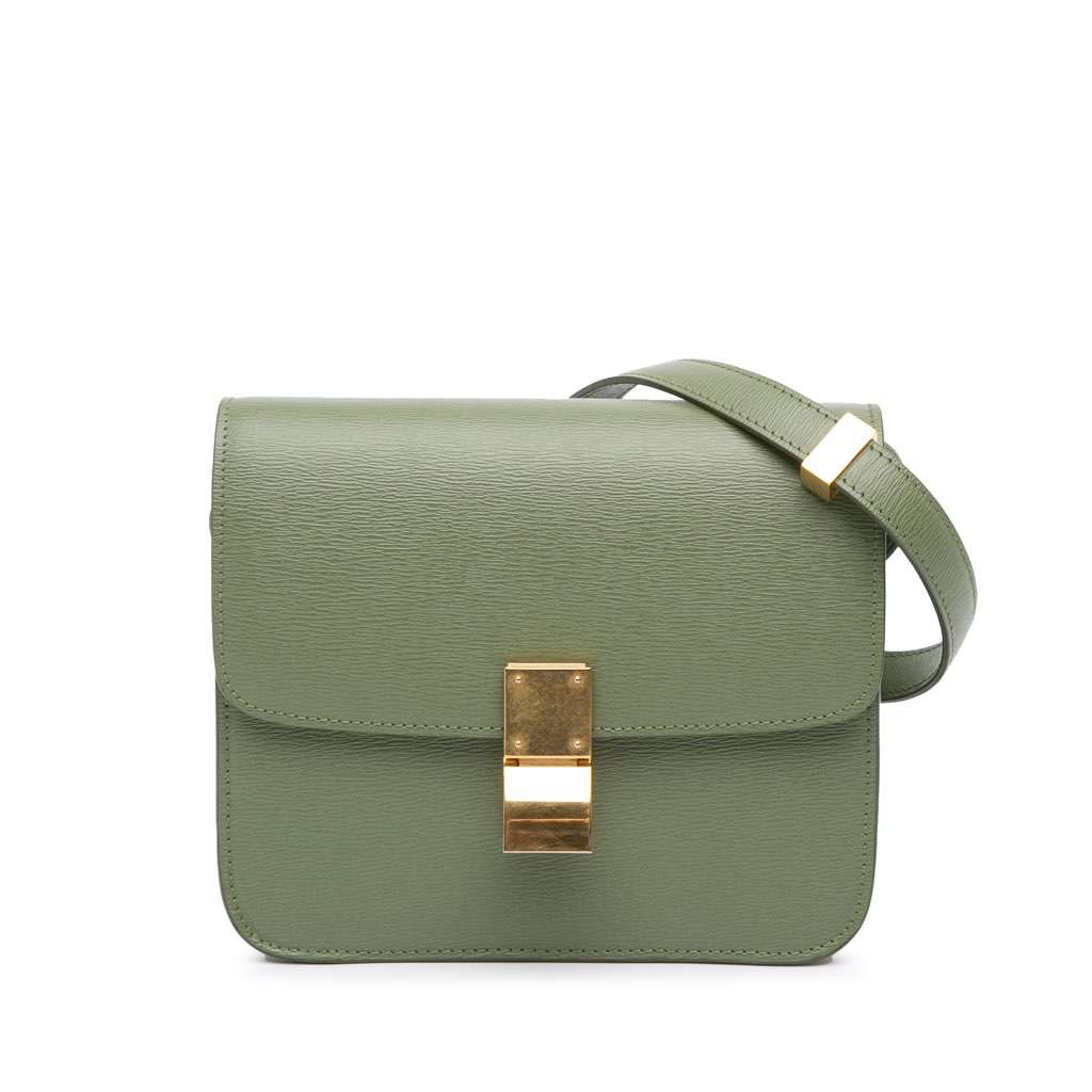 The Classic Box crossbody bag features a leather body, a flat leather strap, a front flap with a push lock closure, and interior slip and zip pockets.