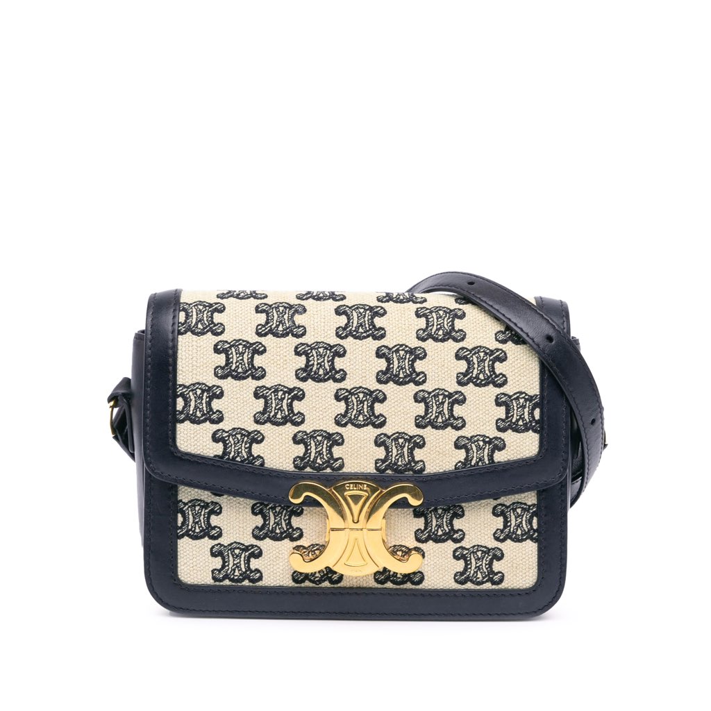 This crossbody bag features an embroidered canvas body with leather trim, an adjustable flat leather shoulder strap, a front flap with push lock closure, and interior zip and slip pockets.