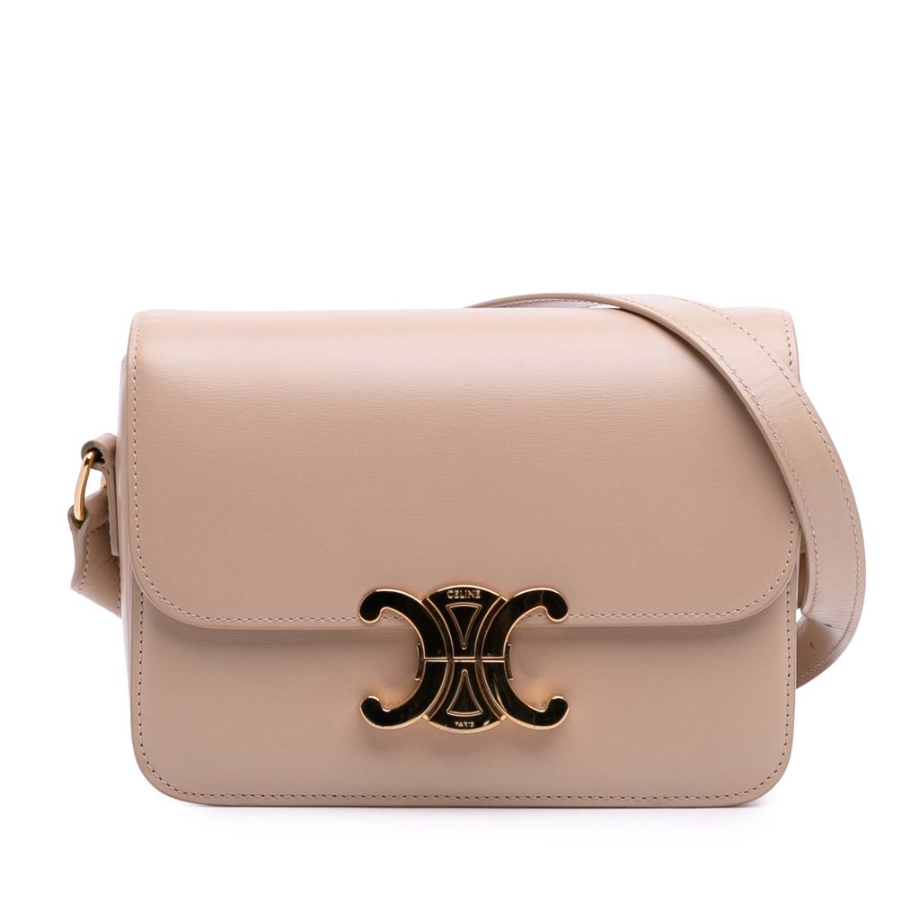 The Teen Triomphe crossbody features a leather body, a flat leather shoulder strap, a front flap with push lock closure, and an interior slip pocket.