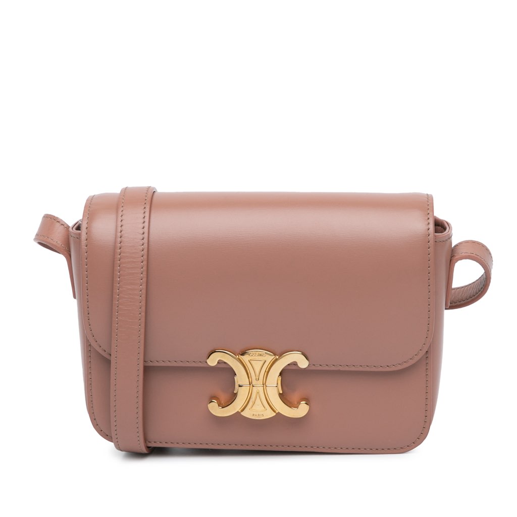 The Teen Triomphe crossbody bag features a leather body, a flat leather shoulder strap, a front flap with push lock closure, and an interior zip pocket. The corners and top were repainted.