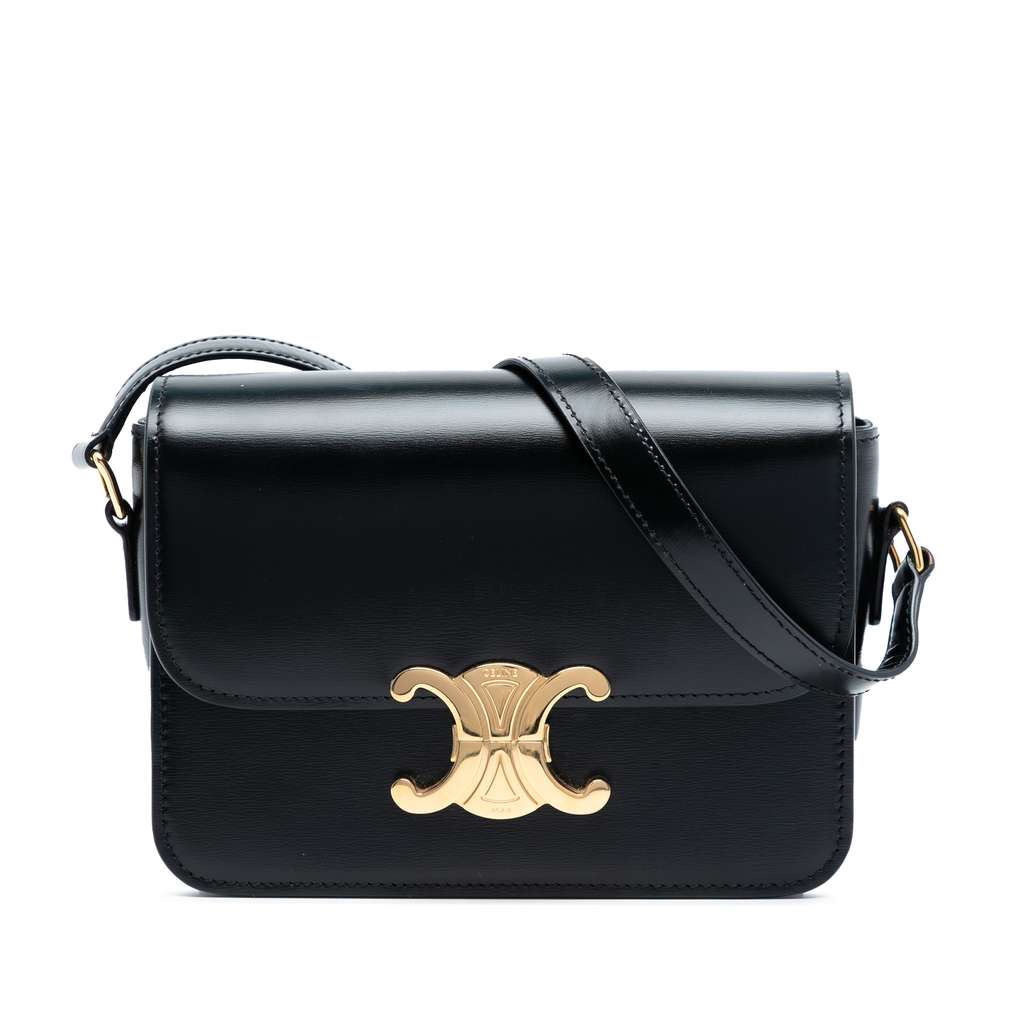 The Triomphe bag features a leather body, a flat leather shoulder strap, a front flap with push lock closure, and an interior slip pocket.