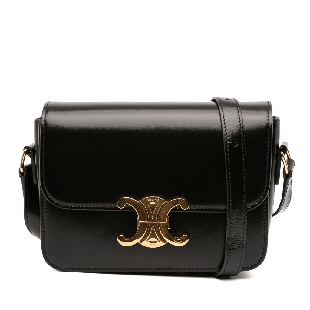 The Triomphe bag features a leather body, a flat leather shoulder strap, a front flap with push lock closure, and an interior slip pocket.