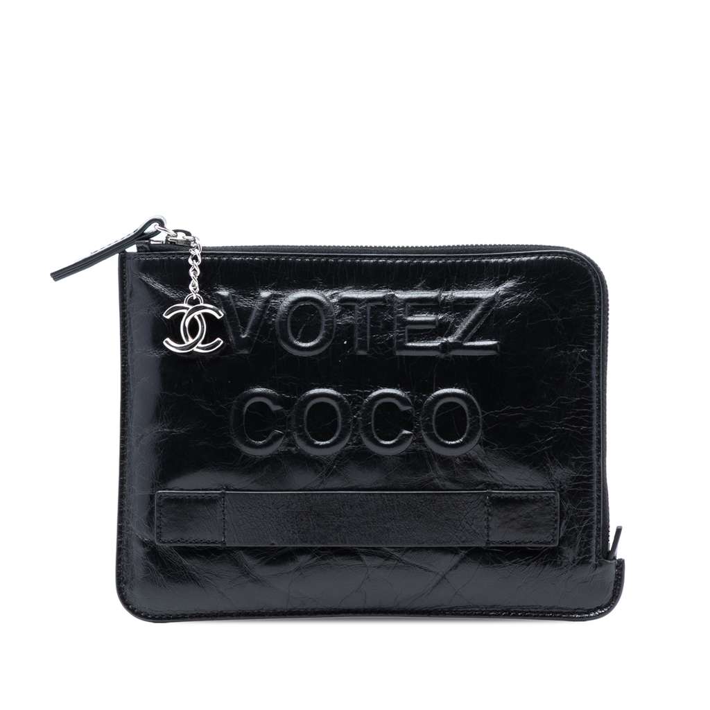 This clutch bag features a lambskin leather body, a top zip closure, an exterior back slip pocket, and interior zip and slip pockets.