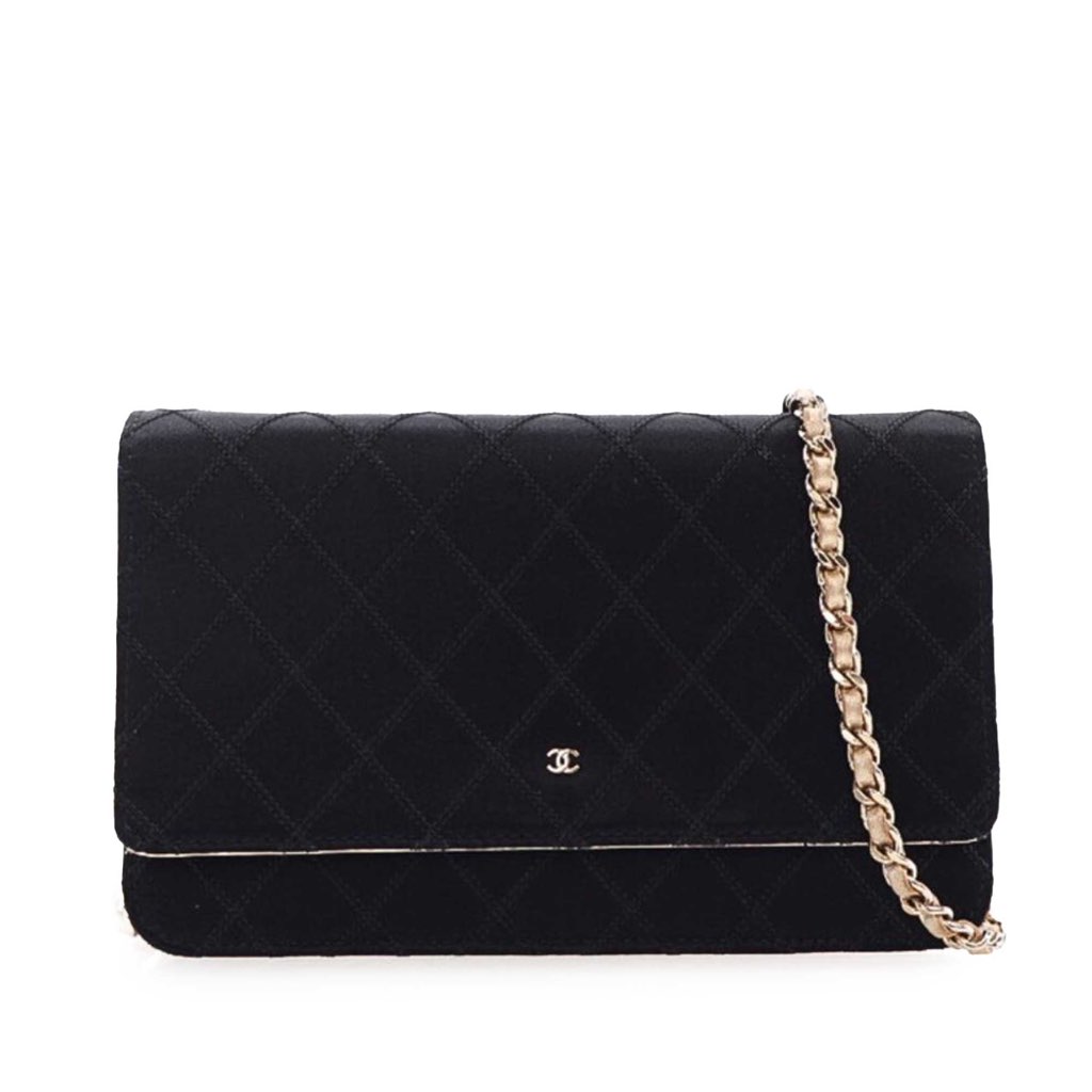 This wallet on chain features a quilted satin body with leather trim, a leather-woven chain strap, a front flap with snap closure, an interior zip compartment, and interior card slots.