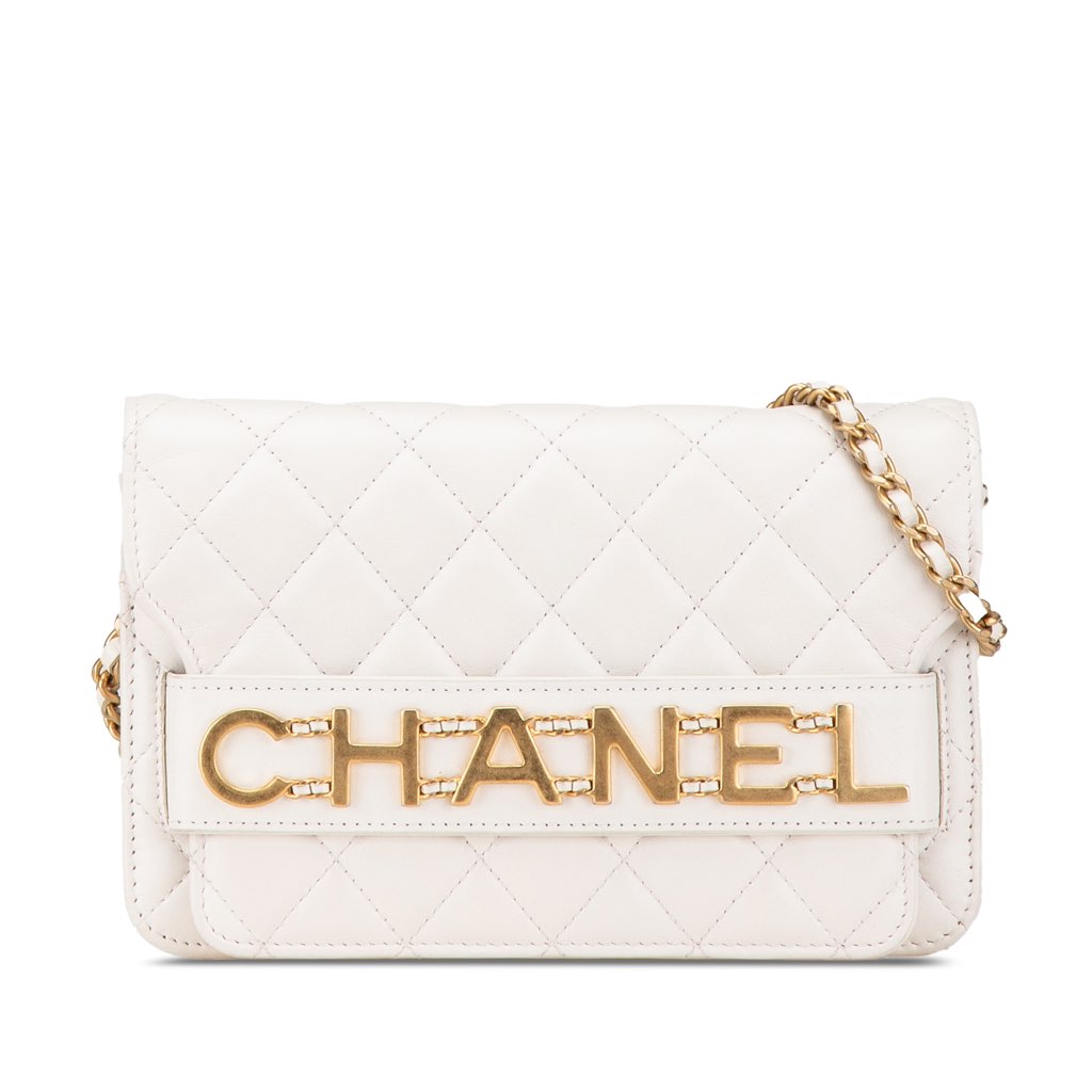 This crossbody bag features a quilted calf leather body, a leather woven chain strap, a front flap with magnetic closure, interior zip and slip pockets, and interior card slots.