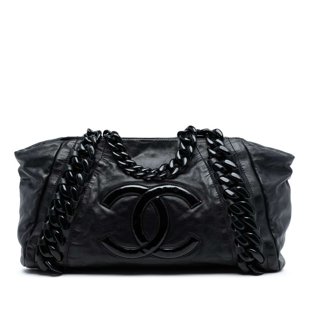 This tote bag features a leather body, chain link straps, an open top with magnetic closure, and interior zip and slip pockets.