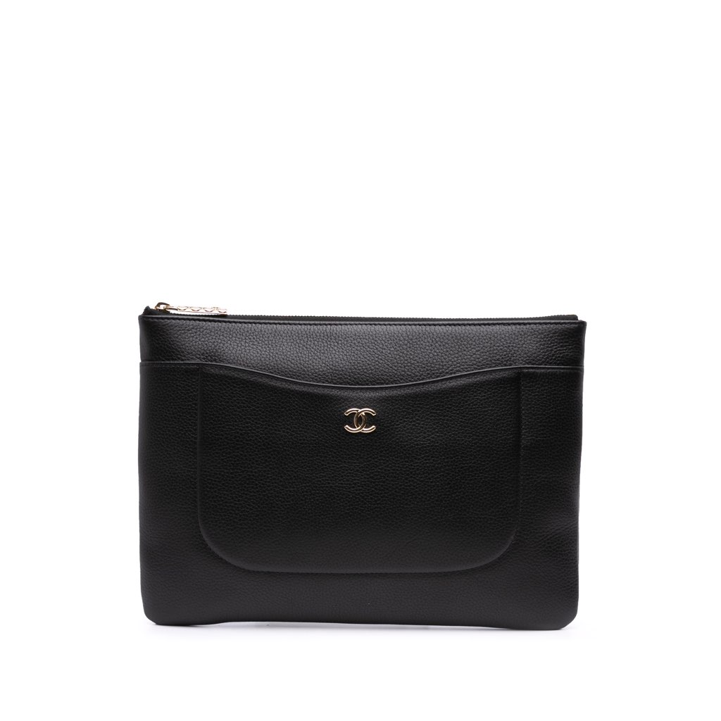 This clutch features a grained calfskin leather body, a top zip closure, and an exterior slip pocket.