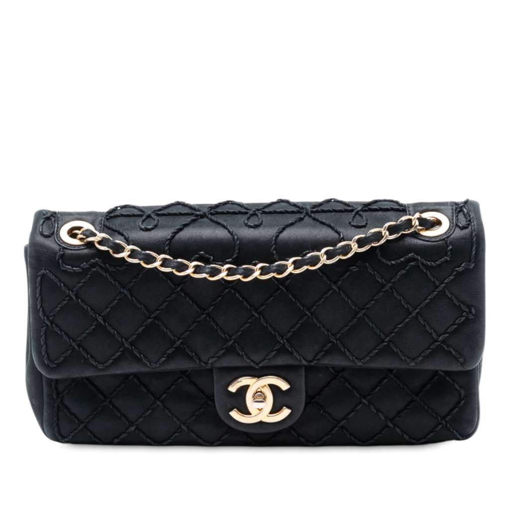 This shoulder bag features a calf leather body, leather woven chain link straps with leather guard, a front flap with an interlocking CC twist lock closure, and an interior zip pocket.