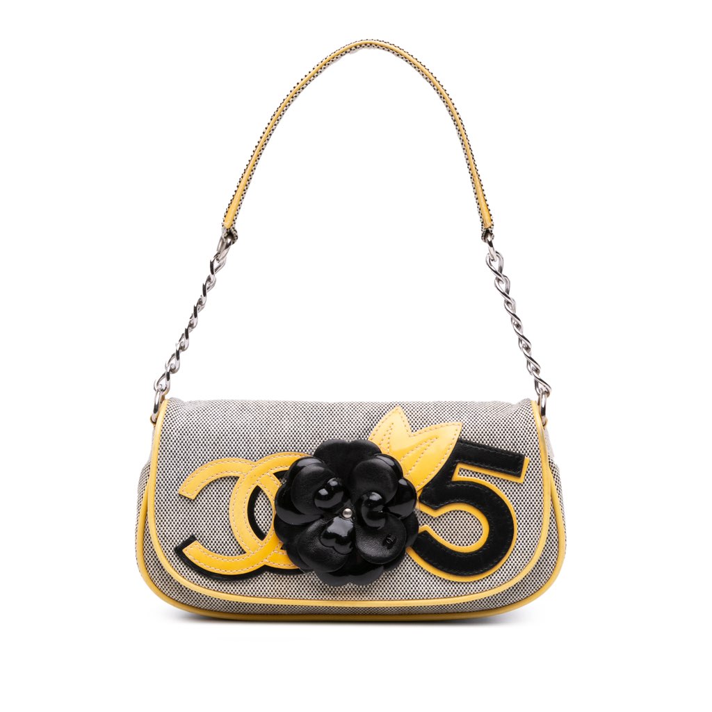 The No. 5 shoulder bag features a canvas body with patent leather trim, a curb chain strap with a flat leather and canvas guard, a front flap with a magnetic snap button closure, and an interior slip pocket.