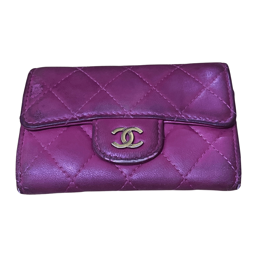 Description:Dark-pink Chanel card holder made from caviar leather with quilting and a flap secured by the CC logo.Size:•~11.4 cm (width)•~7.6 cm (height)•~1.9 cm (depth)