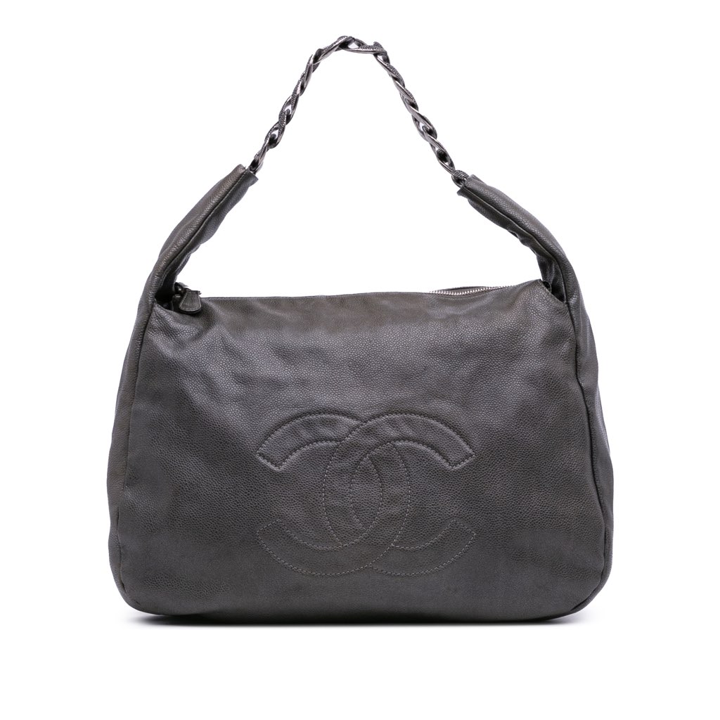 This hobo bag features a caviar leather body, chain strap, a top zip closure, and an interior zip pocket.