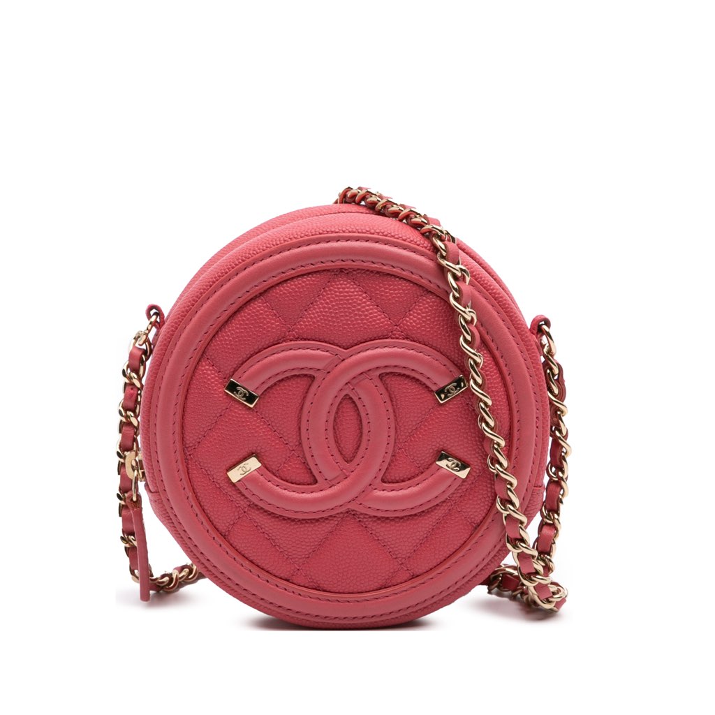 The Filigree features a quilted caviar leather body, a leather woven chain strap, a top zip closure, and interior slip pockets.