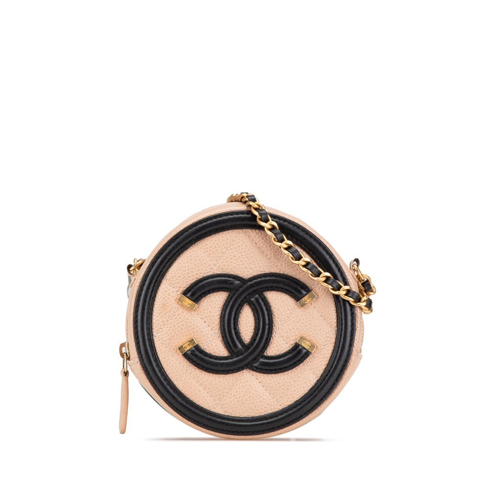 The CC Filigree features a quilted caviar leather body, a leather woven chain link strap, a top zip closure, and interior slip pockets.