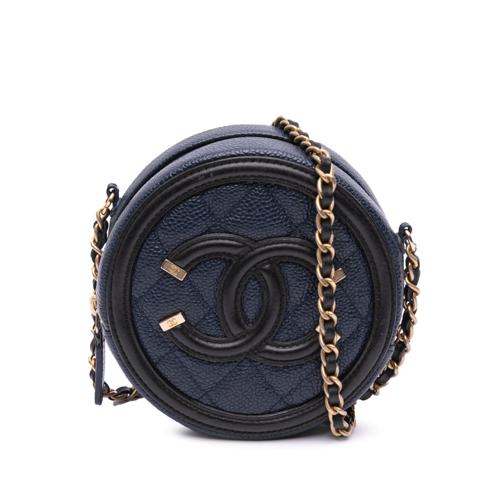 The Filigree features a quilted caviar leather body, a leather woven chain strap, a top zip closure, and interior slip pockets.