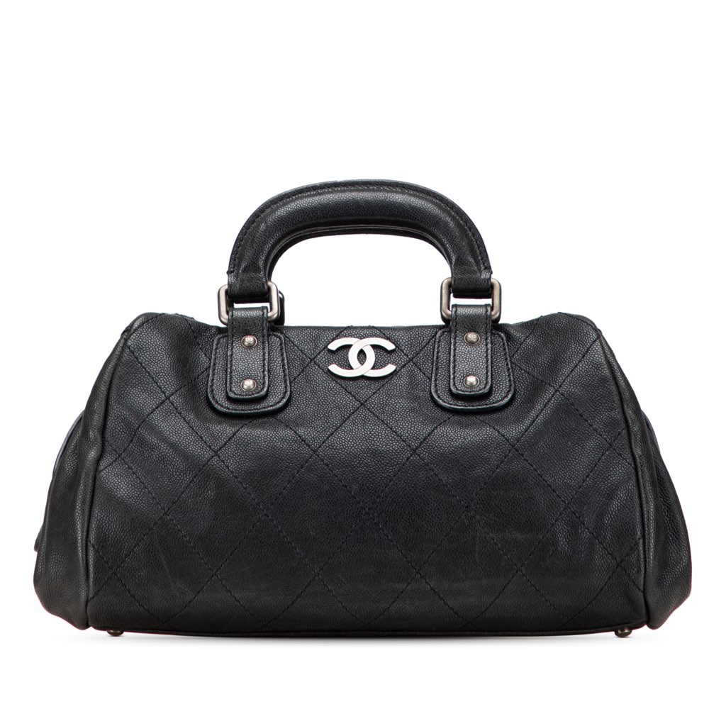 This handbag features a caviar leather body, structured leather handles, a top zip closure, and an interior zip pocket.