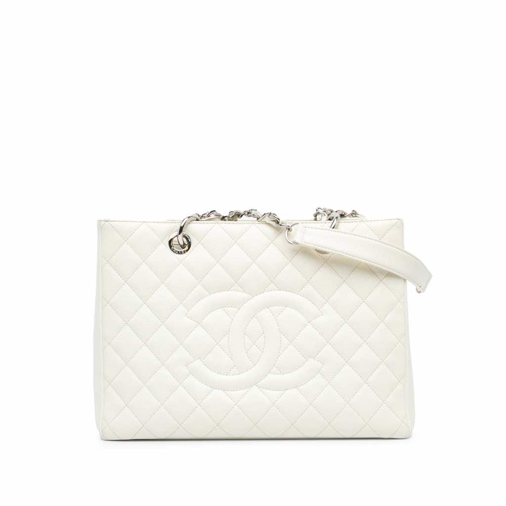 The Grand Shopping Tote features a caviar leather body, curb chain handles, an open top, an exterior back slip pocket, and interior zip and slip pockets.