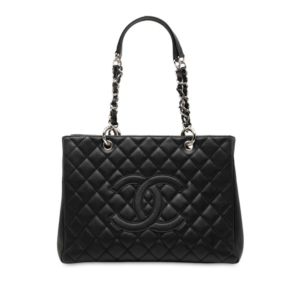 The Grand Shopping Tote features a quilted Caviar leather body, leather woven chain shoulder straps, an open top, an interior zip compartment, an exterior back slip pocket, and interior zip and slip pockets.
