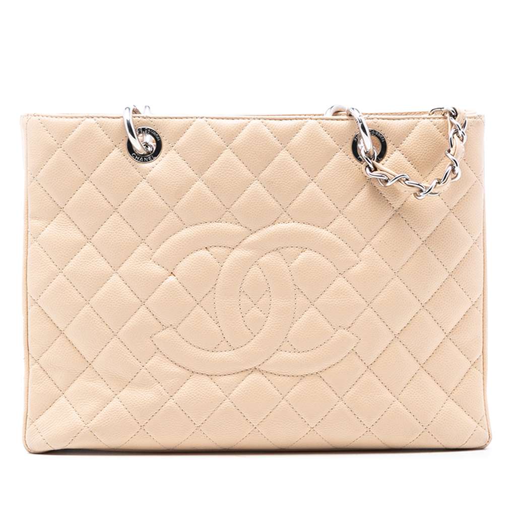 The Grand Shopping Tote features a quilted caviar leather body, leather woven chain shoulder straps, an open top, an exterior slip pocket, and interior zip and slip pockets.