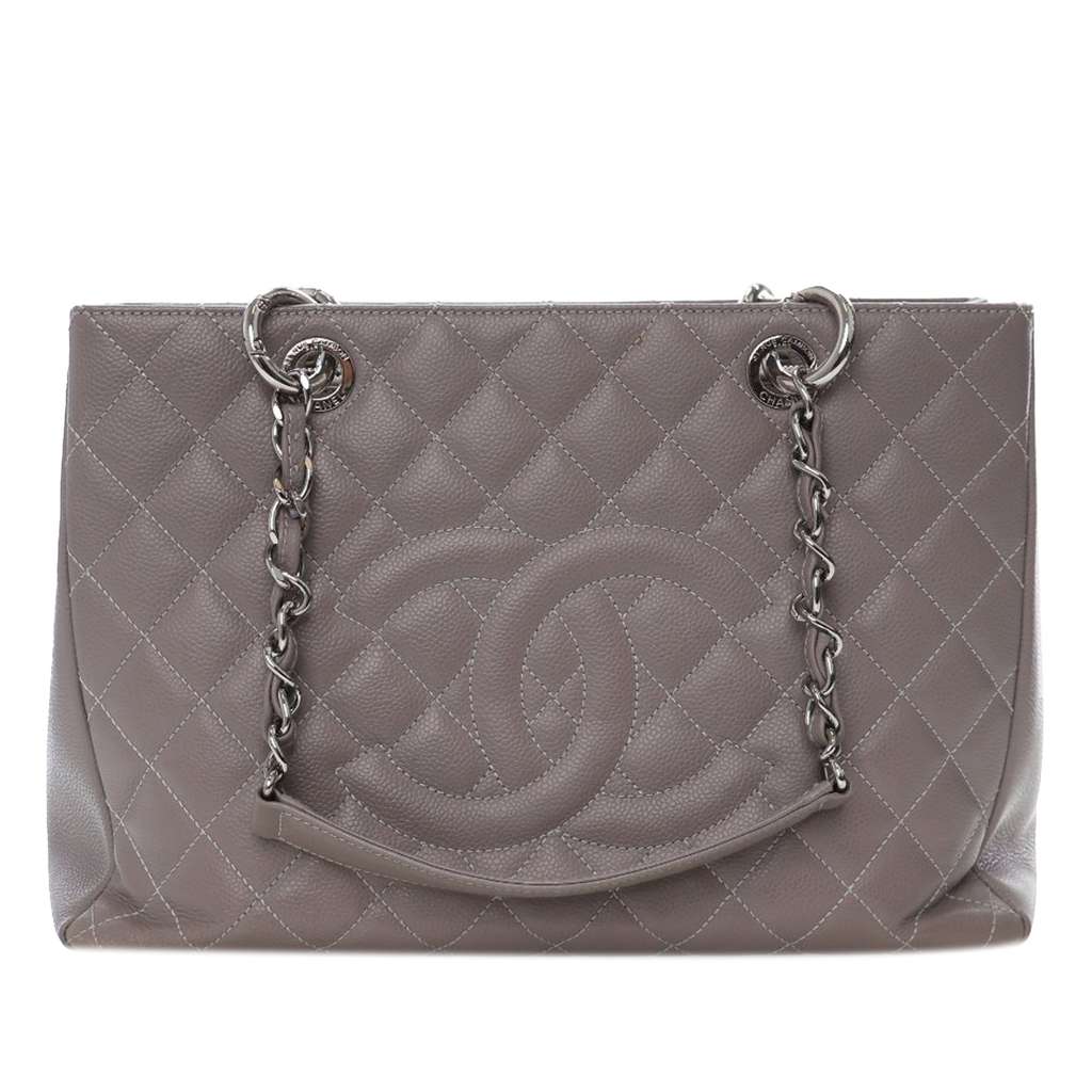The Grand Shopping Tote features a quilted caviar leather body, leather woven chain shoulder straps, an open top, an interior zip compartment, an exterior back slip pocket, and interior zip and slip pockets.