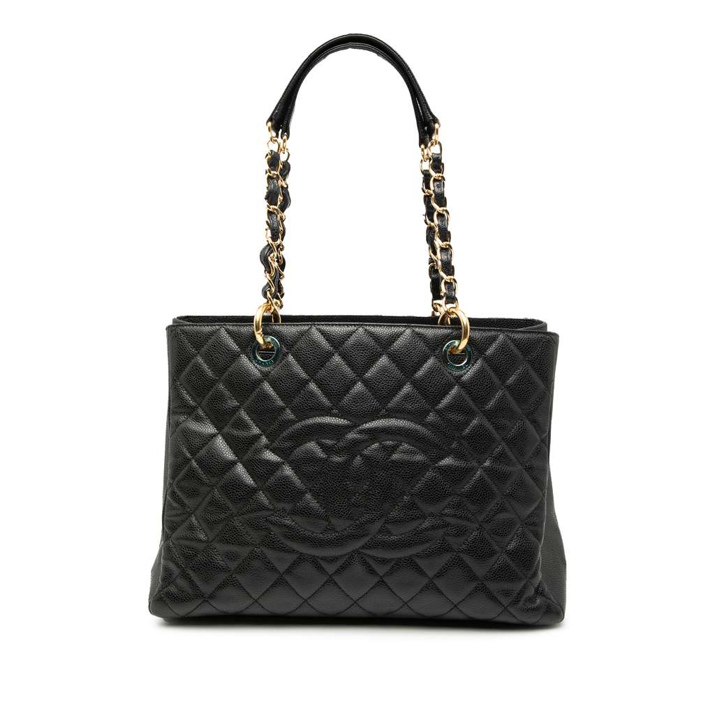 The Grand Shopping Tote features a quilted caviar leather body, leather woven chain shoulder straps, an open top, an interior zip compartment, an exterior back slip pocket, and interior zip and slip pockets.