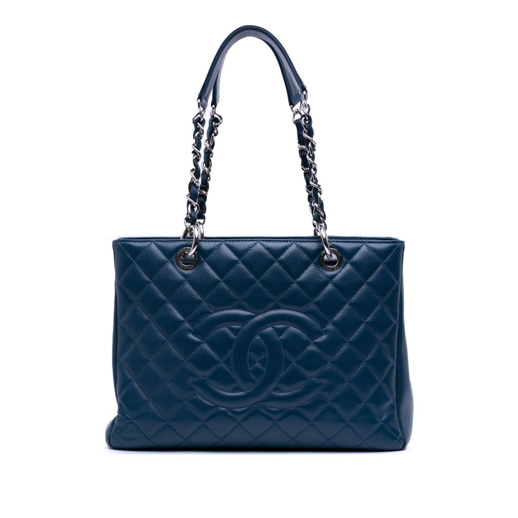 The Grand Shopping Tote features a caviar leather body, curb chain straps, an open top, an exterior back slip pocket, and interior zip and slip pockets.