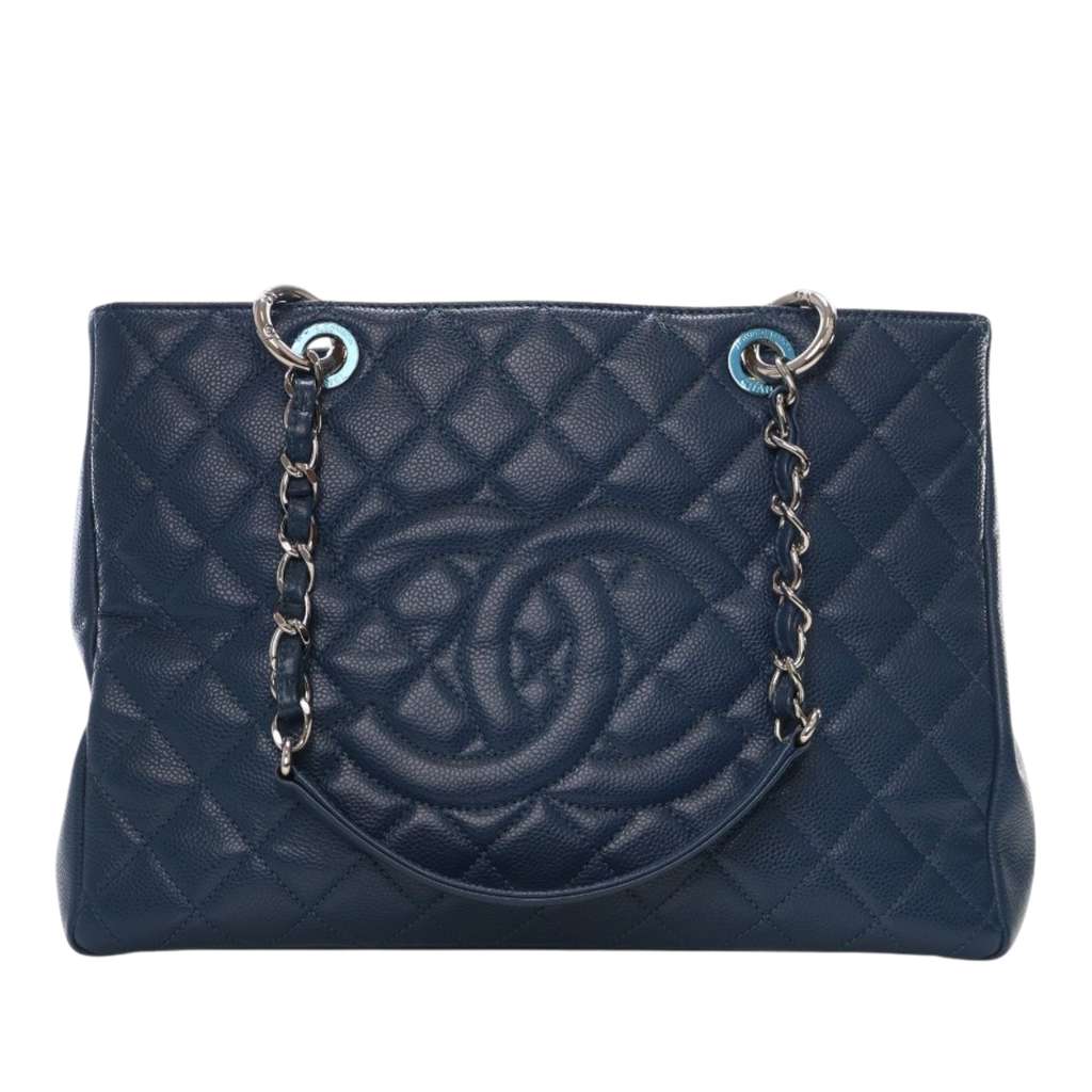 The Grand Shopping Tote features a caviar leather body, curb chain straps, an open top, an exterior back slip pocket, and interior zip and slip pockets.