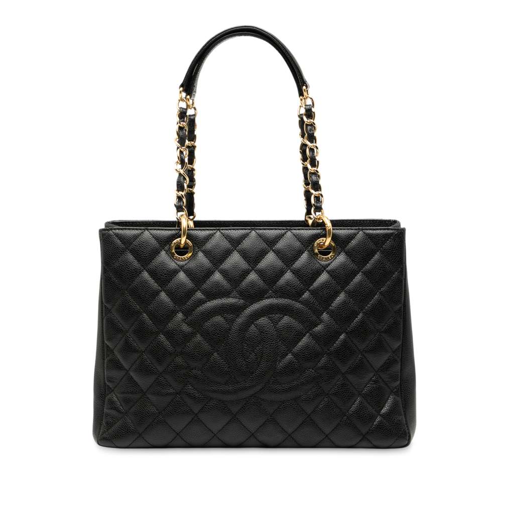 The Grand Shopping Tote features a quilted Caviar leather body, leather woven chain shoulder straps, an open top, an interior zip compartment, an exterior back slip pocket, and interior zip and slip pockets.