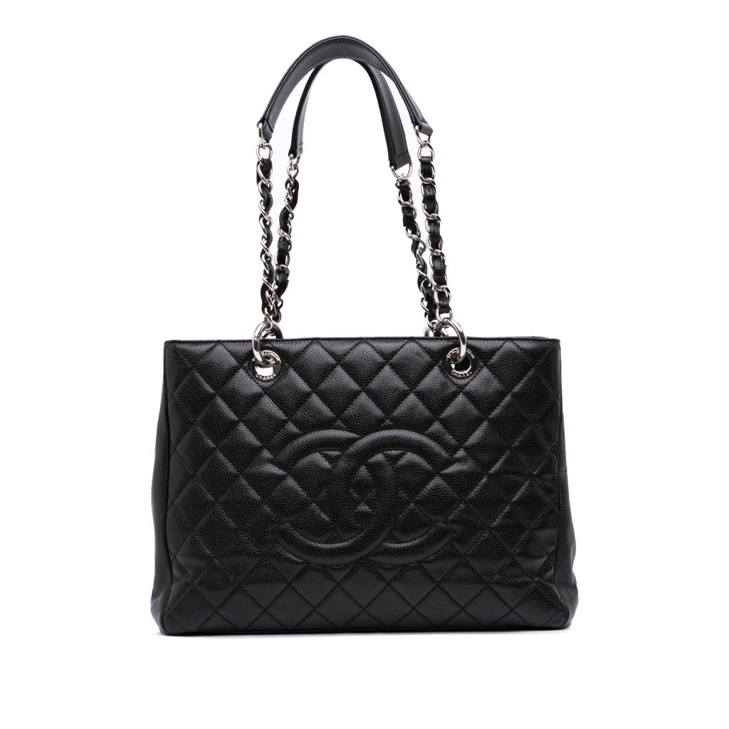 The Grand Shopping Tote features a quilted Caviar leather body, leather woven chain shoulder straps, an open top, an interior zip compartment, an exterior back slip pocket, and interior zip and slip pockets.