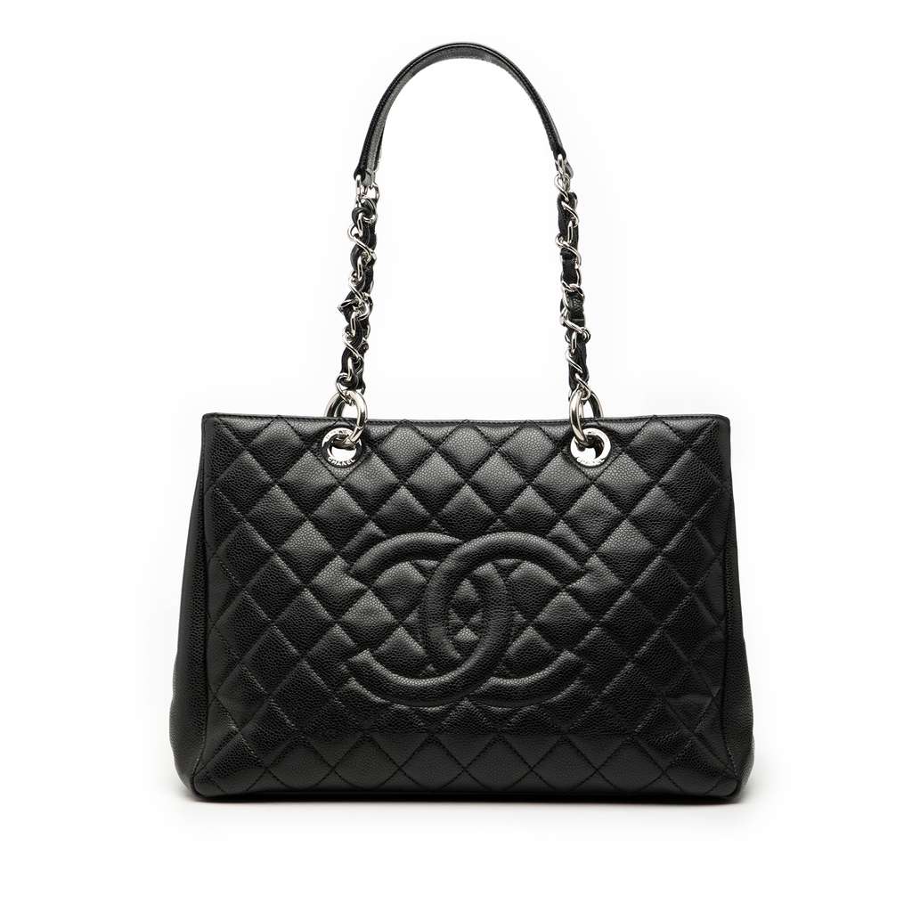 The Grand Shopping Tote features a quilted Caviar leather body, leather woven chain shoulder straps, an open top, an interior zip compartment, an exterior back slip pocket, and interior zip and slip pockets.